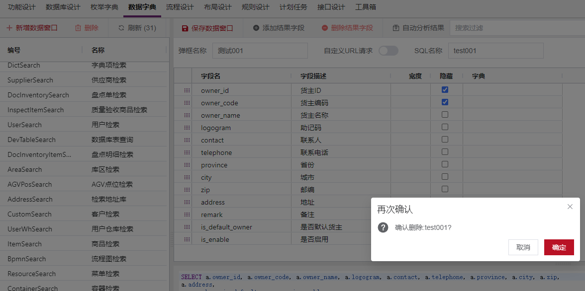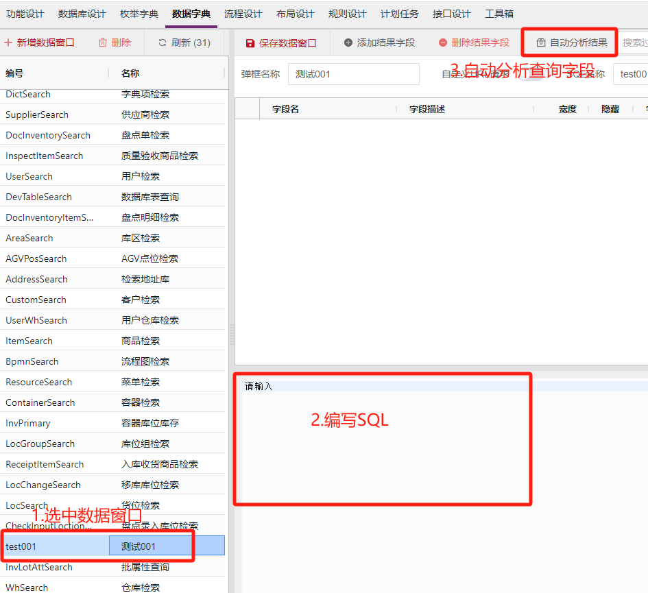 首先编写数据窗口的sql语句,支持mybatis语法。写完之后,点击“自动分析结果”按钮,系统会自动填充sql查询结果字段信息